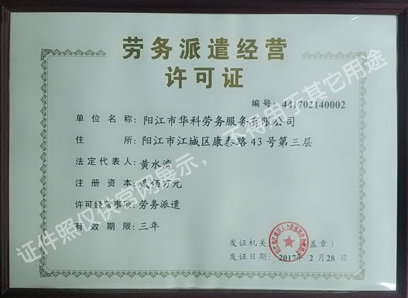 華科勞務(wù)服務(wù)有限公司是專業(yè)從事人事代理、勞務(wù)租賃、人力派遣及管理的綜合性服務(wù)機構(gòu),是首批獲得廣東省人力資源廳、陽江市勞動和社會保障局頒發(fā)人力資源許可證的合法單位。公司秉承“誠信務(wù)實、專業(yè)熱情、滿意第一、服務(wù)社群”的經(jīng)營理念,在勞務(wù)派遣業(yè)務(wù)的基礎(chǔ)上,更致力于合同制工人(臨時工、實習生、假期工)方向發(fā)展,為用工企業(yè)及時輸送合格的各類人才,合理調(diào)配人力資源的有序流動,幫助求職者尋求更加滿意的就業(yè)渠道和崗位,切實維護求職者的合法權(quán)益。